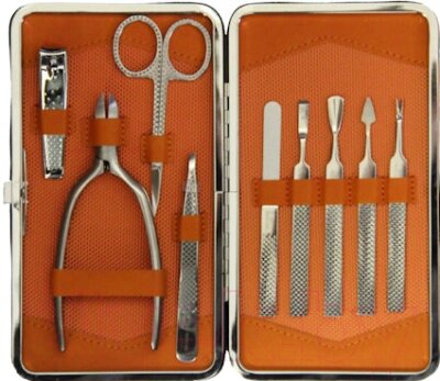 - Инструменты в наборе пинцет, шабер, пушер, триммер для кутикулы, ножницы для ногтей, книпсер, пилка для ногтей, кусачки для кутикулы