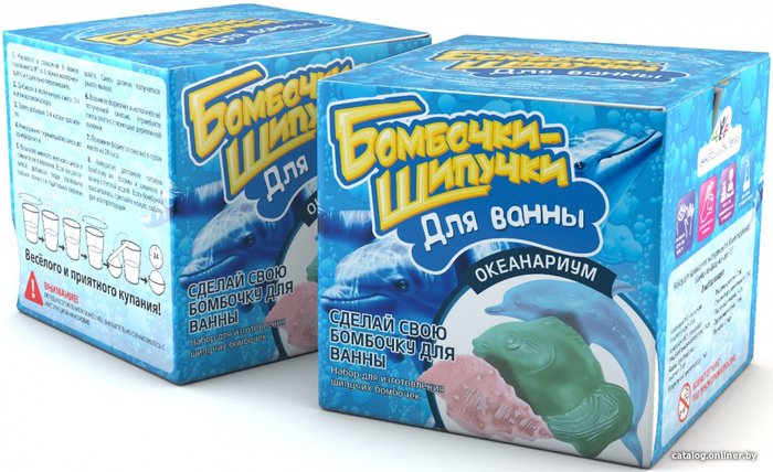 - Состав набора пакетик с компонентом №1, созданном на основе пищевой соды, пакетик с компонентом №2, сделанным на основе лимонной кислоты, три формочки для бомбочек (дельфин, рыбка, ракушка), флакон с ароматизатором, 2 флакона с пищевыми красителями, стаканчик для размешивания, пластиковая ложка, 4 деревянные палочки, одноразовые перчатки