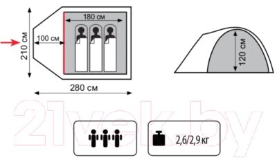 - Комплектация тент, внутренняя палатка, комплект дуг, комплект колышков, сумка-переноска с ручками.