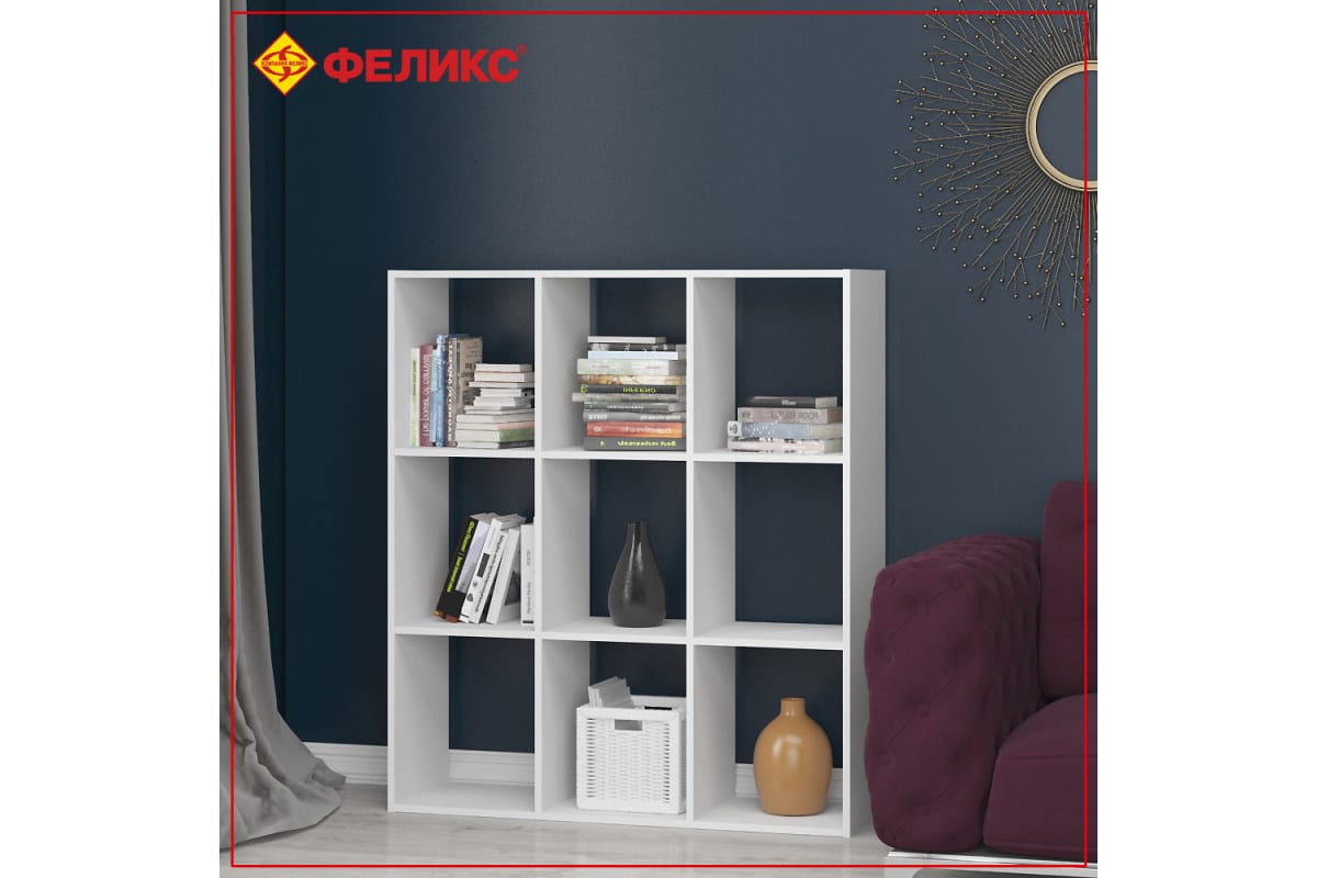 Стеллаж ФЕЛИКС 9-ти секционный белый шагрень ПК-ОБИ-СЖ124Х108-В1-1068 станет украшением интерьера дома или квартиры. Вместительная конструкция деревянного стеллажа может использоваться как книжный шкаф или полка для игрушек, стеллаж для инструментов. Стеллаж деревянный для хранения вещей впишется в любой интерьер детской, гостиной, кухни, спальни, балкона или прихожей. В комплекте идет подробная инструкция по сборке и весь необходимый крепеж.