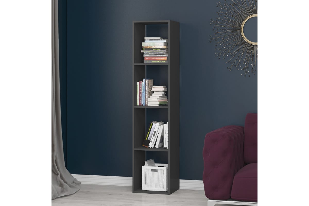Стеллаж ФЕЛИКС 4-х секционный высокий антрацит ПК-ОБИ-СЖ164Х37-В1-297 станет украшением интерьера дома или квартиры. Вместительная конструкция деревянного стеллажа может использоваться как книжный шкаф или полка для игрушек, стеллаж для инструментов. Стеллаж деревянный для хранения вещей впишется в любой интерьер детской, гостиной, кухни, спальни, балкона или прихожей. В комплекте идет подробная инструкция по сборке и весь необходимый крепеж.