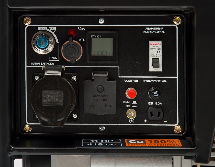 - Функции постоянный ток на выходе (DC 12 В)разъем для блока ATSавторегулятор напряжения (AVR)дисплейсчетчик моточасоввольтметр