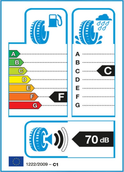 - Sukibimas su šlapia danga Šis parametras nurodo padangos protektoriaus sukibimo kontakto su kelio danga lygį. Reikšmė A - tai pats aukščiausias sukibimo lygis, tuo tarpu F - pats žemiausias. Padangos, turinčios aukštą sukibimo lygį, stabdymo kelias bus žymiai mažesnis. C