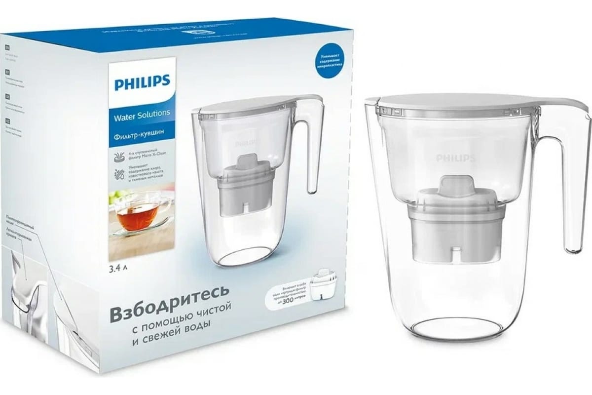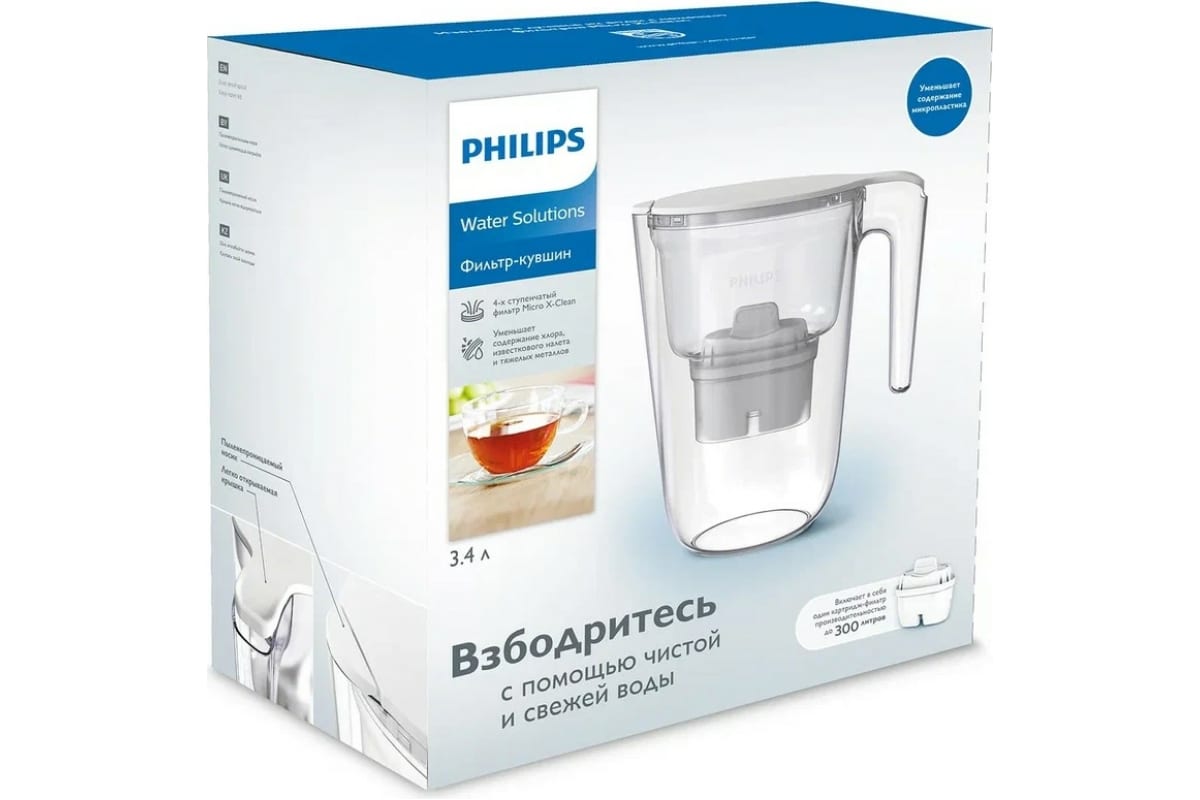 Фильтр-кувшин для воды PHILIPS AWP2937WH/51 снижает концентрацию пестицидов, микропластика, задерживает до 99 % хлора и свинца, снижает жесткость воды.