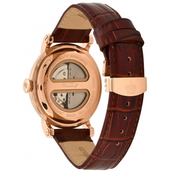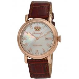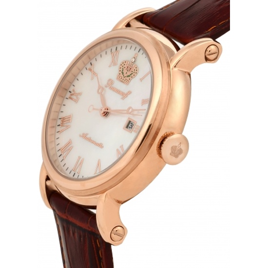 Механизм: механический с автоподзаводом MiyotaКоличество рубиновых камней: 21Функции: центральные часовая и минутная стрелки, центральная секундная стрелка, календарь чисел месяцевПротивоударное устройство: естьЦиферблат: натуральный перламутр, фианит в короне, римские цифрыКорпус: гипоаллергенная нержавеющая сталь, 5 мкр. позолота, стеклянная обратная крышкаДиаметр корпуса: 44 ммТолщина корпуса: 11 ммСтекло: закаленное швейцарское минеральное, высокоустойчивое к царапинам и другим внешним воздействиямРемень: итальянская натуральная кожа, пряжка butterfly, выделка «Крокодил», цвет - бургундиШирина ремня: 22 ммВлагозащита: 5 АТМ