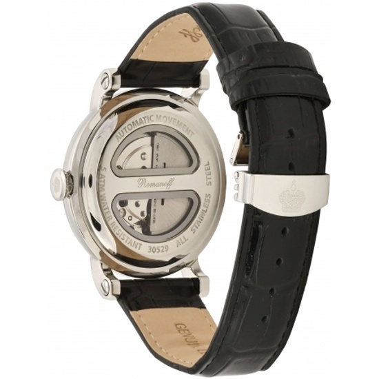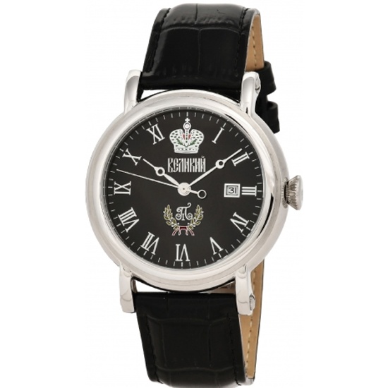 Петр I Великий – последний русский царь и первый российский император из династии Романовых, взошедший на престол в десятилетнем возрасте. В истории остался, как великий реформатор и человек, «прорубивший окно в Европу». В годы правления Петра Великого Россия изменилась до неузнаваемости: границы страны расширились, экономика существенно поднялась, а на берегу Невы вырос город Санкт-Петербург, который и сегодня считается одним из красивейших в мире.Энергичный правитель сделал ставку на развитие отечественных производственных предприятий, умело перенимая опыт, опираясь на их технический прогресс. Возвеличивание личности Петра началось сразу после его кончины, хотя сам он в жизни был непритязательным и славой не грезил. Благоговейный культ правителя продолжался во все времена и при всех политических режимах в стране.Механизм: механический с автоподзаводом Miyota, Япония (по заказу Romanoff)Калибр: 8215Количество рубиновых камней: 21Функции: центральные часовая и минутная стрелки, центральная секундная стрелка, календарь чисел месяцевПротивоударное устройство: естьЦиферблат: натуральный морской перламутр, римские цифры, фианит в короне, черная эмаль, императорская геральдикаКорпус: гипоаллергенная нержавеющая сталь, стеклянная крышкаДиаметр корпуса: 44мм.Толщина корпуса: 11мм.Стекло: закаленное швейцарское минеральное, высокоустойчивое к царапинам и другим внешним воздействиямРемень: итальянская натуральная кожа, выделка «Крокодил», пряжка butterflyШирина ремня: 22мм.Влагозащита: 5 АТМ