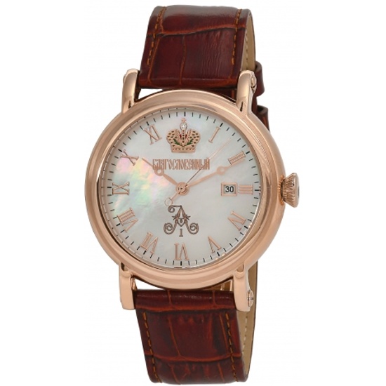 В историю Император Всероссийский Александр I, правящий с 1801 по 1825 года, вошел как выдающийся политический и государственный деятель своего времени, победитель Наполеона, возглавивший победоносную борьбу страны за независимость в сложнейших условиях с сильным противником, поднявшим против России почти всю Европу. Международный авторитет России был при Александре Благословенном одним из самых высоких за всю ее историю.Слава и известность российского императора Александра I не только в России, но и за ее пределами. Память, сохранившаяся о нем в памятниках, улицах и площадях, носящих его имя, так или иначе отсылает нас к тем славным событиям, в которых он сыграл ведущую роль. Он был решителен и предприимчив, помимо всего, он также был внешне красив, эффектен, позер, любимец публики и женщин. В 1814 году Сенат преподнес императору в знак его заслуг титул Благословенный.Механизм: механический с автоподзаводом Miyota, Япония (по заказу Romanoff)Калибр: 8215Количество рубиновых камней: 21Функции: центральные часовая и минутная стрелки, центральная секундная стрелка, календарь чисел месяцевПротивоударное устройство: естьЦиферблат: натуральный морской перламутр, римские цифры, фианит в короне, черная эмаль, императорская геральдикаКорпус: гипоаллергенная нержавеющая сталь, позолота 5 мкр стеклянная крышкаДиаметр корпуса: 44мм.Толщина корпуса: 11мм.Стекло: закаленное швейцарское минеральное, высокоустойчивое к царапинам и другим внешним воздействиямРемень: итальянская натуральная кожа, выделка «Крокодил», пряжка butterflyШирина ремня: 22мм.Влагозащита: 5 АТМ