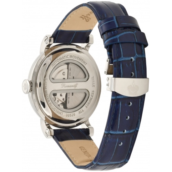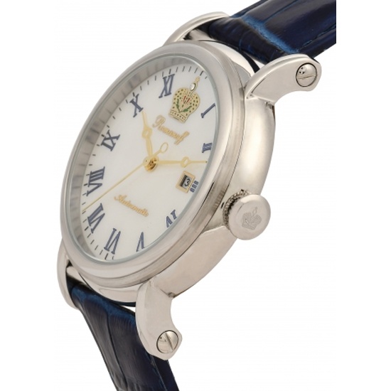Механизм: механический с автоподзаводом MiyotaКоличество рубиновых камней: 21Функции: центральные часовая и минутная стрелки, центральная секундная стрелка, календарь чисел месяцевПротивоударное устройство: естьЦиферблат: натуральный перламутр, фианит в короне, римские цифрыКорпус: гипоаллергенная нержавеющая сталь стеклянная обратная крышкаДиаметр корпуса: 44 ммТолщина корпуса: 11 ммСтекло: закаленное швейцарское минеральное, высокоустойчивое к царапинам и другим внешним воздействиямРемень: итальянская натуральная кожа, пряжка butterfly, выделка «Крокодил», цвет - синийШирина ремня: 22 ммВлагозащита: 5 АТМ