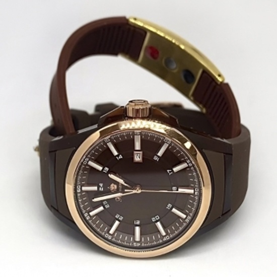 Легкие стильные часы идеально сочетаются с удобным силиконовым энергетическим браслетом, включающим в себя особые магнитные и биокерамические вставки, которые делают их обладателя более энергичными, повышают работоспособность, оказывают антистрессовый эффект, ускоряют восстановление после физических нагрузок.Состав браслета:Биоинертный и легкий силиконСталь и эмаль4 вставки: неодимовый магнит силой 1500 Гаусс, красная турмалиновая вставка, белая турмалиновая вставка, черная вставка с германиемСвойства магнитов:Усиливает кровообращениеСтабилизирует артериальное давлениеСнимают отеки и мышечную больСпособствуют крепкому снуПридают высокий энергетический тонусТерапевтические свойства турмалинаСпособствует расширению сосудов и капилляровВыводит токсиныПроявляет антистрессовый эффектТонизирует и придает энергиюСвойства германия:Стимулирует иммунные силы организмаСпособствует восстановлению организма после физических нагрузокЛегкость силиконовых украшений обеспечивает особый комфорт! Браслет не заменим при занятиях спортом, в повседневной жизни и в рабочее время. Длительность использования без ограничений.Как ухаживать: не рекомендуется носить на одной руке вместе с часами (желательно на разных руках), не ронять изделие с большой высоты, ударять о другие предметы, избегать сильного нагревания браслета (не кладите в машину летом и не оставляйте под прямыми солнечными лучами), храните отдельно от пластиковых и банковских карточек, чтобы они не размагнитились под действием магнитного поля изделия.Не является медицинской продукцией.Механизм: японский кварцевый механизм SeikoКалибр: SEIKO VX21Функции: календарь чисел месяцев, центральные часовая, минутная, секундная стрелкиПротивоударное устройство: естьЦиферблат: цвет - коричневый, позолоченные стрелки и индексы со светомассойКорпус: гипоаллергенная нержавеющая сталь, TR 90 - гипоаллергенный облегченный пластик для оптики, позолоченный безель 3 мкрДиаметр корпуса: 43 ммСтекло: закаленное швейцарское минеральное, высокоустойчивое к царапинам и другим внешним воздействиямРемень: классическая позолоченная пряжка, цвет - коричневый, матовый силиконВлагозащита: 5 АТМ