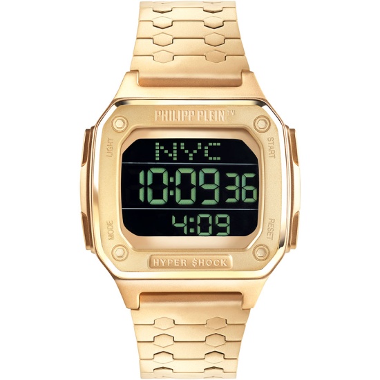 Электронные часы. Подсветка. Секундомер. Будильник. Дата. Черный дисплей. Корпус выполнен из нержавеющей стали с IP покрытием цвета желтого золота. Диаметр корпуса составляет 44 мм, толщина 12 мм. Стальной браслет с покрытием, раскладывающаяся застежка. Прочное минеральное стекло устойчивое к мелким механическим повреждениям.