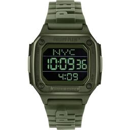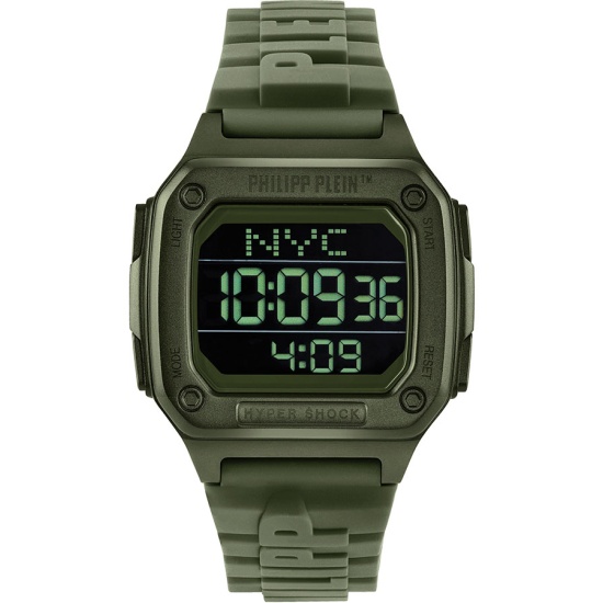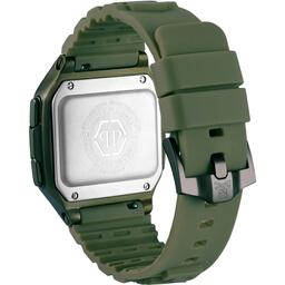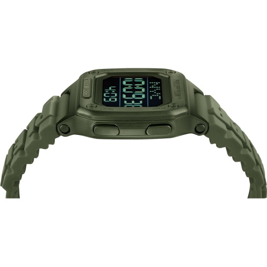 Электронные часы. Подсветка. Секундомер. Будильник. Дата. Черный дисплей. Корпус выполнен из нержавеющей стали с зеленым IP покрытием. Диаметр корпуса составляет 44 мм, толщина 12 мм. Зеленый силиконовый ремешок, стандартная застежка. Прочное минеральное стекло устойчивое к мелким механическим повреждениям.