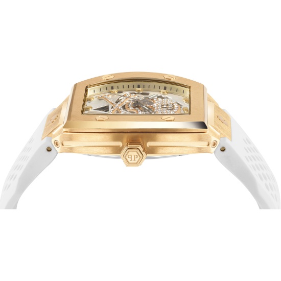 Мужские механические часы с автоподзаводом. Центральные часовая, минутная и секундная стрелки. Белый скелетонизированный циферблат с изображением черепа. Корпус формы тонно выполнен из нержавеющей стали с IP покрытием цвета желтого золота. Диаметр корпуса составляет 44 мм, толщина 14 мм. Белый силиконовый ремешок с перфорацией, стандартная застежка. Прочное минеральное стекло устойчивое к мелким механическим повреждениям.