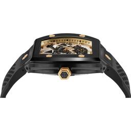 Мужские механические часы с автоподзаводом. Центральные часовая, минутная и секундная стрелки. Белый скелетонизированный циферблат с изображением черепа. Корпус формы тонно выполнен из нержавеющей стали с черным IP покрытием. Диаметр корпуса составляет 44 мм, толщина 14 мм. Черный силиконовый ремешок с перфорацией, стандартная застежка. Прочное минеральное стекло устойчивое к мелким механическим повреждениям.