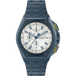 Мужской кварцевый хронограф. Центральные часовая и минутная стрелки, секундная стрелка вынесена на малый циферблат. Апертура даты в позиции 3 часов. Секундомер. Белый циферблат. Корпус выполнен из нержавеющей стали с темно-синим IP покрытием. Диаметр корпуса составляет 44 мм. Заводная головка с защитой. Стальной браслет с покрытием, раскладывающаяся застежка. Прочное минеральное стекло устойчивое к мелким механическим повреждениям.