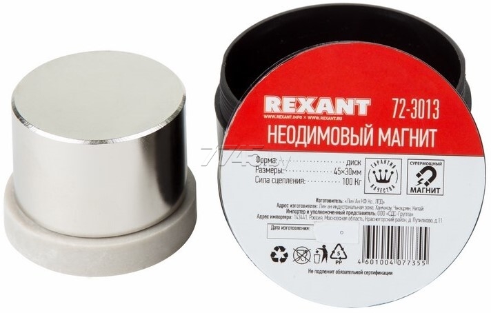 Магнит неодимовый 45х30 мм диск REXANT (72-3013) — постоянный мощный редкоземельный магнит, состоящий из сплава неодима, бора и железа. Известен своей мощностью притяжения и высокой стойкостью к размагничиванию. Имеет металлический внешний вид, очень востребован и применяется в разных областях промышленности, медицины, в быту и электронике, вот только малая часть применения: восстановление магнитных свойств других магнитов; фиксация и зажим (за счёт большой силы сцепления с помощью магнита можно зафиксировать большие и тяжелые предметы и использовать вместо струбцин или тисков); фокусы и трюки; поиск стальных предметов (в земле, песке, грунте, стенах, на полу); эксперименты (на уроках физики); кондиционирование (намагничивание) воды; уничтожение видео, аудиозаписей и данных на магнитных носителях.
