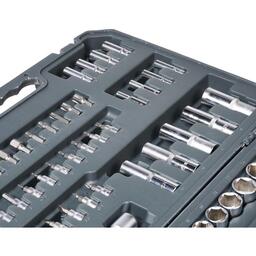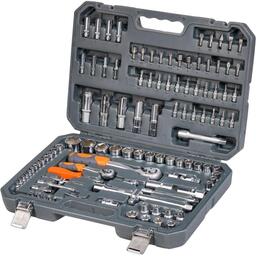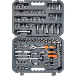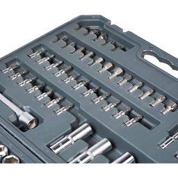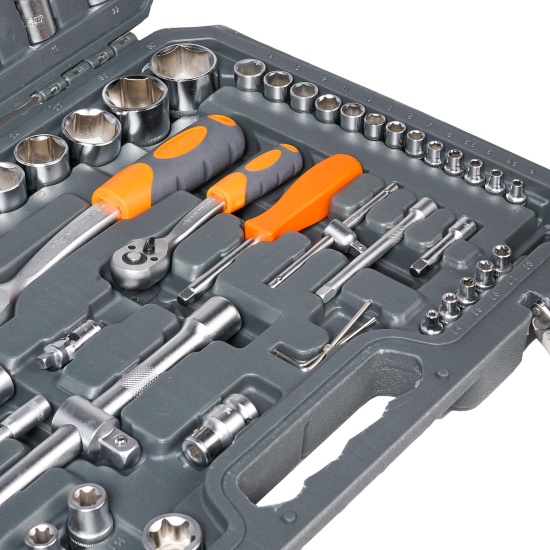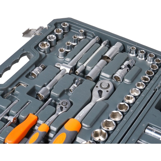 Инструменты соответствуют высоким стандартам качества, поэтому подойдут как для использования на бытовом уровне, так и для применения в профессиональной сфере. Инструменты изготовлены из высококачественной хром-ванадиевой стали. Металлические части изготовлены методом горячей ковки, что придаёт им высокую прочность и долговечность. Финишное прочное хромированное покрытие защищает Инструмент от воздействия коррозии, делает его более износостойким и легко очищается от загрязнений. Финишная обработка двух типов (частичная полировка) головок придаёт им отличный внешний вид.Состав набора:1/4" Головка торцевая 6гр. 4, 4.5, 5, 5.5, 6, 7, 8, 9, 10, 11, 12, 13, 14 Головка торцевая удлиненная 6гр. 6, 7, 8, 9, 10, 11, 12, 13 Трещоточная рукоятка 1/4", 72 зуба Вороток Т-образный 1/4" Отвёрточная рукоятка 1/4" - 1/4" Удлинитель 50мм, 100мм Головка торцевая TORX E4, E5, E6, E7, E8 Карданный шарнир 1/4" Удлинитель гибкий 145ммГ-образный шестигранный ключ 1.5мм, 2мм, 2.5мм Биты в держателе 1/4" TX8, TX 10, TX 15, TX 20, TX 25, TX 27, TX 30, H3, H4, H5, H6, SL 4, SL 5.5, SL 6.5, PH 1, PH 2, PZ 1, PZ 21/2" Биты 8мм H7, H8, H10, H12, H14, SL 8, SL 10, SL 12, PH 3, PH 4, PZ 3, PZ 4, TX 40, TX 45, TX 50, TX 55, TX 60 Головка торцевая 6гр. 8, 10, 11, 12, 13, 14, 15, 16, 17, 18, 19, 21, 22, 24, 27, 30, 32 Головка торцевая удлиненная 6гр. 14, 15, 17, 19, 22 Головка свечная 16мм, 21ммТрещоточная рукоятка 1/2", 72 зуба Держатель для бит 1/2" - 8мм Удлинитель 125мм, 250мм Адаптер для Т-образного воротка 1/2" Карданный шарнир 1/2" Головка торцевая TORX E10, E11, E12, E14, E16, E18, E20, E24
