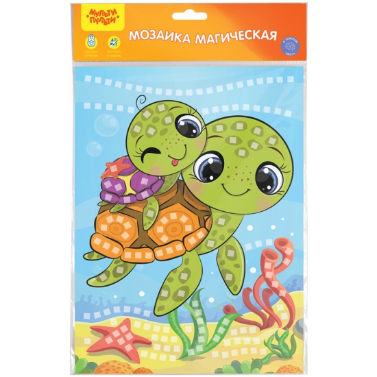 Набор для творчества МУЛЬТИ-ПУЛЬТИ AP_41504 Мозаика самоклеящаяся. Черепашка 21х29,5смМагическая мозаика на самоклеящейся основе «Мульти-Пульти» «Черепашка» предназначена для детей старше трёх лет. Бренд представляет оригинальную поделку, которую можно сделать из картонной основы и блока с элементами из EVA (уже входят в набор). Работать над ней очень легко. Для этого не требуются ножницы или клей, всё необходимое предусмотрено в комплекте. Процесс заинтересует с первых секунд, он способствует расширению кругозора и формированию эстетического вкуса. Кроме того, на оборотной стороне картонной основы расположена раскраска, что сделает досуг ещё занимательнее.Мозаика влияет на развитие не только мелкой моторики рук, но и творческого потенциала, прививает усидчивость, внимательность и аккуратность. Завершенная поделка станет прекрасным подарком родным и друзьям малыша.Размер: 21*29,5см;Материал для аппликации: мягкий пластик EVA;Основа: картон;Пол: универсальный;Возраст: от 3 лет.