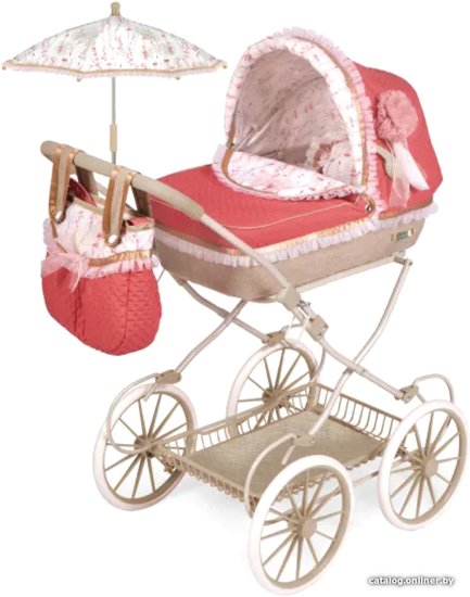 - Коляска для кукол с сумкой и зонтиком Мартина понравится каждой девочке. Она выполнена из красивой стеганой ткани кораллового цвета и комбинирована с гладкой бежевой тканью. Козырёк коляски, края зонта и сумочка декорированы золотой тесьмой, а украшают комплект многочисленные бантики и ленточки, которые так нравятся девочкам. Расстояние от пола до ручки 81 см.Коляска с люлькой-качалкой, металлическим складным шасси с подвеской и классическими хромированными колесами. Благодаря корзинке в нижней части девочки смогу брать с собой необходимые вещи и аксессуары для любимой игрушки. Бесшумные колеса коляски изготовлены из высококачественного полиуретана и легко преодолевают препятствия на пути. Складной механизм позволяет легко и компактно сложить коляску после прогулки. Козырёк коляски может регулироваться и фиксироваться в разных положениях. Удобная ручка имеет специальную антискользящую накладку, а также на ней размещена сумочка, которую можно использовать отдельно и носить на плече с помощью длинного ремешка.Внутри коляска отделана белой тканью с цветочным принтом. В комплекте есть матрац и подушка в форме конфетки. Эксклюзивная, элегантная и очень реалистичная отделка. Выглядит "как настоящая". Эта красивая коляска станет любимым атрибутом для прогулок. С ней ваша принцесса будет самой стильной из всех "мам", прогуливающихся со своими куклами. Коляска для кукол с сумкой и зонтиком Мартина понравится каждой девочке. Она выполнена из красивой стеганой ткани кораллового цвета и комбинирована с гладкой бежевой тканью. Козырёк коляски, края зонта и сумочка декорированы золотой тесьмой, а украшают комплект многочисленные бантики и ленточки, которые так нравятся девочкам. Расстояние от пола до ручки 81 см.Коляска с люлькой-качалкой, металлическим складным шасси с подвеской и классическими хромированными колесами. Благодаря корзинке в нижней части девочки смогу брать с собой необходимые вещи и аксессуары для любимой игрушки. Бесшумные колеса коляски изготовлены из высококачественного полиуретана и легко преодолевают препятствия на пути. Складной механизм позволяет легко и компактно сложить коляску после прогулки. Козырёк коляски может регулироваться и фиксироваться в разных положениях. Удобная ручка имеет специальную антискользящую накладку, а также на ней размещена сумочка, которую можно использовать отдельно и носить на плече с помощью длинного ремешка.Внутри коляска отделана белой тканью с цветочным принтом. В комплекте есть матрац и подушка в форме конфетки. Эксклюзивная, элегантная и очень реалистичная отделка. Выглядит "как настоящая". Эта красивая коляска станет любимым атрибутом для прогулок. С ней ваша принцесса будет самой стильной из всех "мам", прогуливающихся со своими куклами.