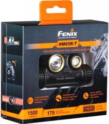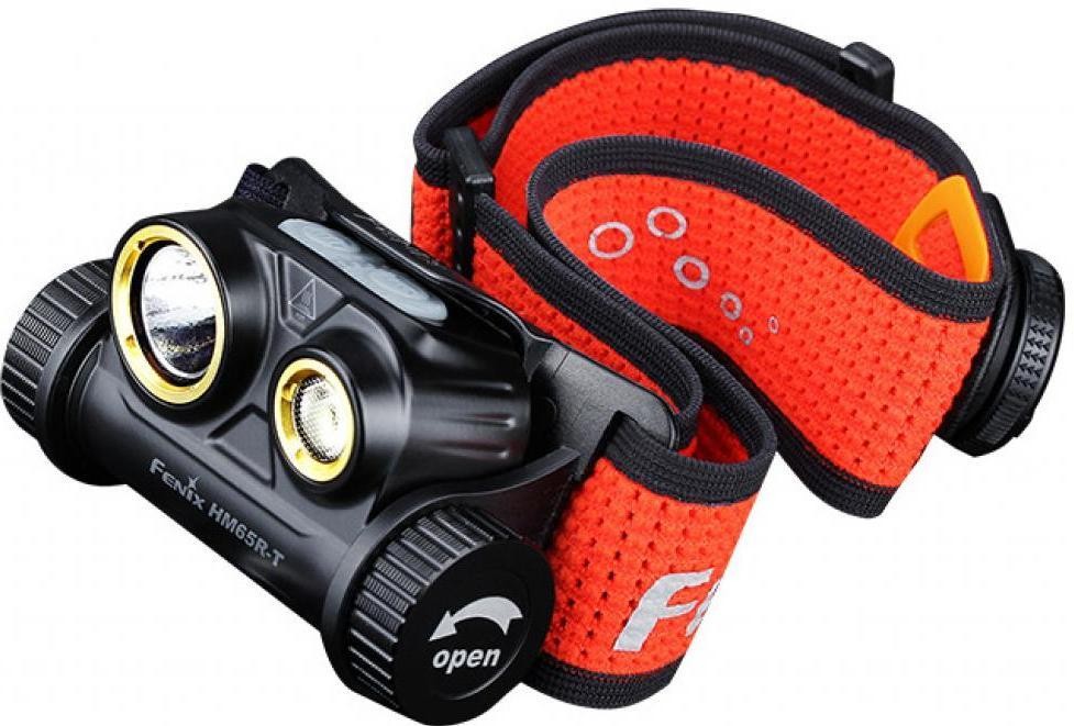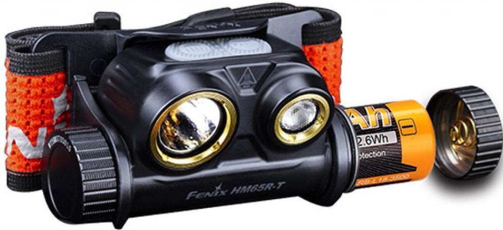 Модель ліхтаря Fenix HM65R-T являє собою налобник і вона - перезаряджається. Найбільша яскравість заявлена на рівні 1300 люменів, а найбільша дистанція освітлення досягає 170 метрів. Тут в наявності світлодіод Luminus SST40 білого освітлення, а також світлодіод Cree XP-G2, завдяки якому ви отримаєте нейтральне біле світло. Ресурс експлуатації світлодіода торгової марки Cree досягає п'ятдесяти тисяч годин. Живиться налобник за рахунок літій-іонної батареї форм-фактора 18650, яка передбачена в наборі разом з даною моделлю. Можливо також використання двох батарей CR123A. Крім того, ліхтар захищений від неправильної установки-переполюсовкі елементів живлення.