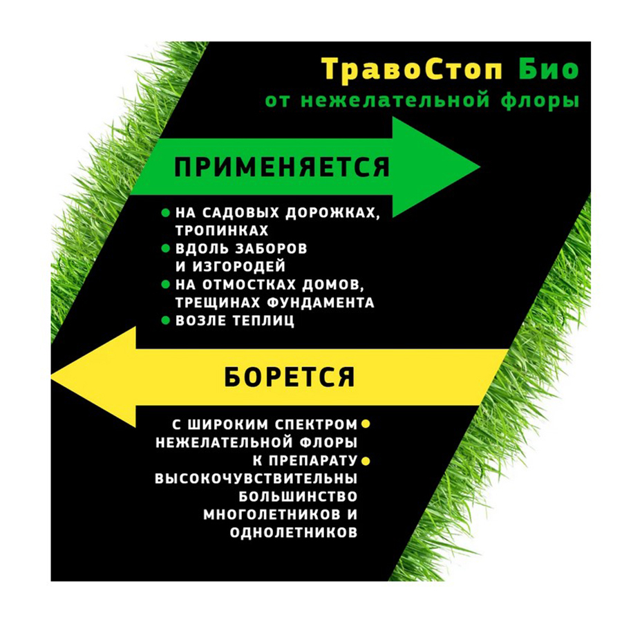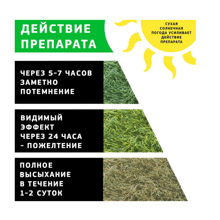Препарат для борьбы с нежелательной флорой. Действующее вещество природного происхождения. Препарат полностью биоразлагаем. Видимый эффект через 24 часа. Полная гибель нежелательной флоры наблюдается в течение 1-3 суток в зависимости от вида и размера растения, а также применяемой дозы препарата. Борется с широким спектром нежелательной флоры (более 500 видов). К препарату высокочувствительны большинство многолетников и однолетников: однодольных и двудольных. Применяется: на садовых дорожках, тропинках, вдоль заборов и изгородей, на отмостках домов, трещинах фундамента, возле теплиц, между гряд.