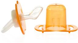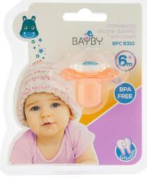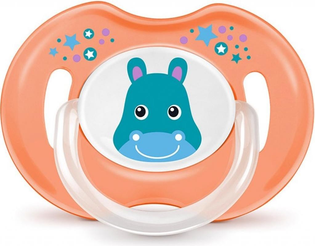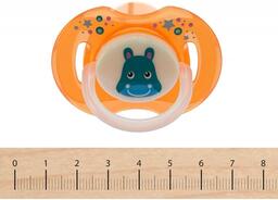 Пустушка Bayby BPC6310 оформлена в яскраві відтінки помаранчевого і прикрашена милим бегемотом. Призначена для діток від 6 місяців (6+).
