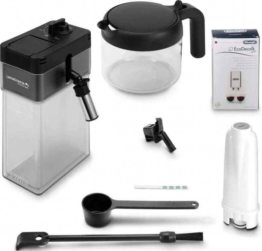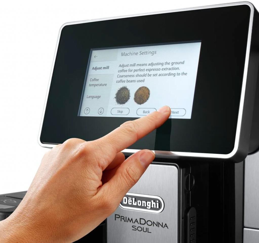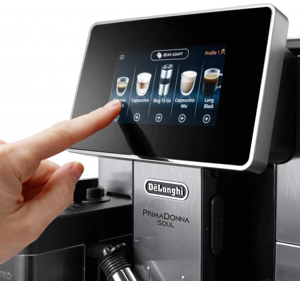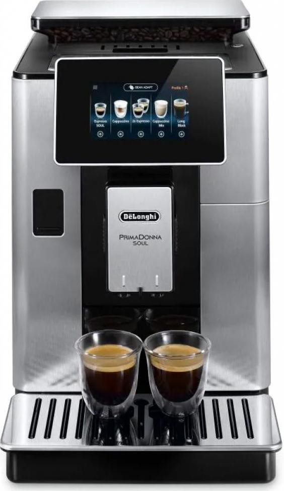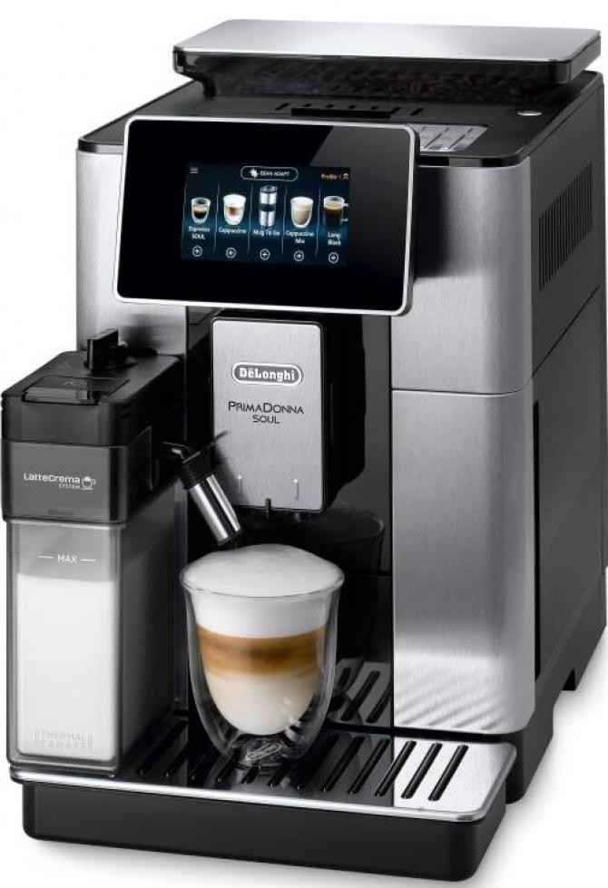 Кофемашина автоматична Delonghi PrimaDonna Soul ECAM 610.74.MB проводиться в сучасному стильному дизайні. Настільний апарат потужністю 1450 Вт створює тиск 19 бар і готує напої із зерен і меленої кави. Вода заливається в знімний резервуар об'ємом 2,5 літра і очищається фільтром, а для зерен призначений контейнер місткістю 500 грам. Вбудована млин з регульованим ступенем помелу докладний зерна безпосередньо перед приготуванням. Любителі капучино та інших напоїв з молоком зможуть готувати їх в автоматичному режимі. Модель оснащена технологією Bean Adapt, коректує параметри приготування в залежності від типу, походження, ступеня обсмаження та інших характеристик кави. Два термоблока - для води і для пара і молока - підтримують температуру екстракції в межах від 88с до 96с. Автоматична кавоварка Delonghi PrimaDonna Soul ECAM 610.74.MB обладнана системою самоочищення, а управляється кольоровим сенсорним TFT-дисплеєм з діагоналлю 4,3 дюйма.
