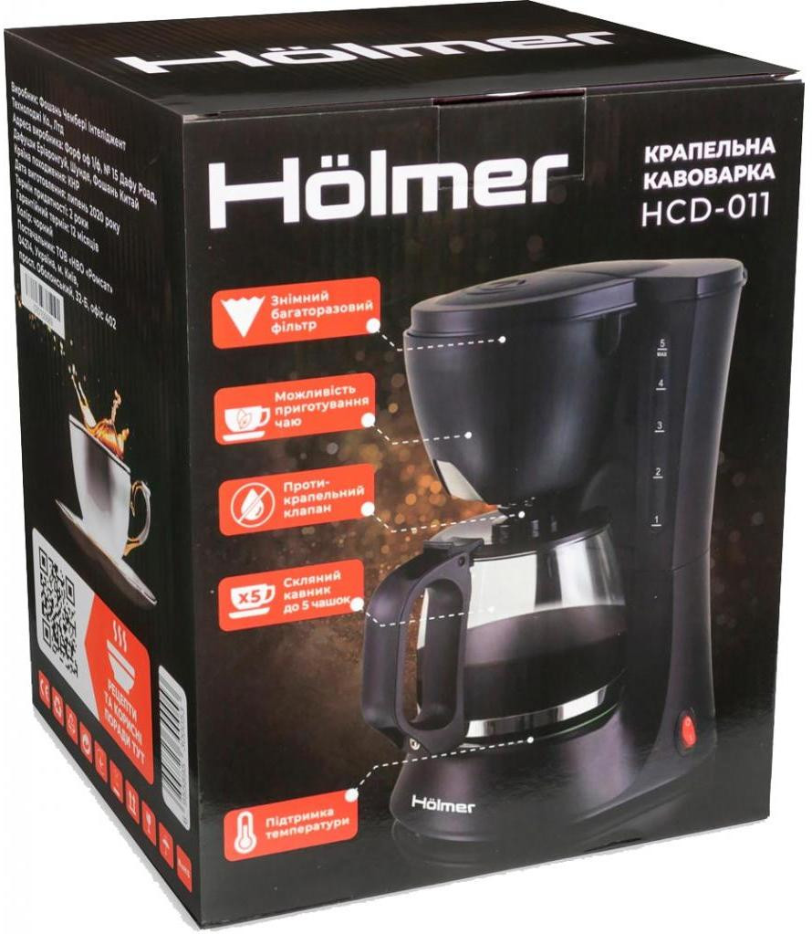 Застосування багаторазового фільтра Кофеварка Holmer HCD-011 використовує для своєї роботи багаторазовий фільтр з нейлону, що дозволить істотно заощадити на витратних матеріалах, необхідних для техніки, коли застосовуються одноразові фільтраційні прокладки. Проточна вода під достатнім напором стане кращим засобом очищення, що не потребував від вас багато часу на процедуру очищення.Пристрій анти-капля Коли ви знімаєте кавник з підставки, можете не боятися, що краплі проллються на майданчик для розміщення ємності з кавою . Механізм зупинки крапель не дасть їм забруднити поверхню кавоварки. Це відбувається без вашого втручання - процес повністю автоматичний. Об'ємний скляний кавник Кава, пройшовши весь шлях свого приготування, в результаті потрапляє в ємність, яка стоїть на платформі. Вона являє собою глечик зі скла, в якому поміщається до 600 мл рідини. А це означає, що у вашому розпорядженні буде близько 5 чашок напою. Зручний носик і зручне руків'я дуже ергономічні в процесі використання. Відмітки з цифрами допомагають зрозуміти, скільки чашок зможе наповнити ємність в даний момент. Пластина, що підігріває ємністьПлатформа, на якій стоїть кавник, є не просто підставкою - це підігріваюча база. Завдяки їй кава весь час гаряча і може подаватися хоч цієї хвилини. Призначена не тільки для кави Варто додати, що ви можете застосовувати представлене пристрій не тільки для заварювання кави - в фільтр можна помістити чай або збір трав, щоб насолодитися їх бездоганним смаком. Захищеність від поломок Засоби захисту від поломок і аварійних ситуацій в представленої моделі дуже добре продумані, за рахунок чого кавоварка не перегрівається і не піддається дії надмірно сильного тиску.