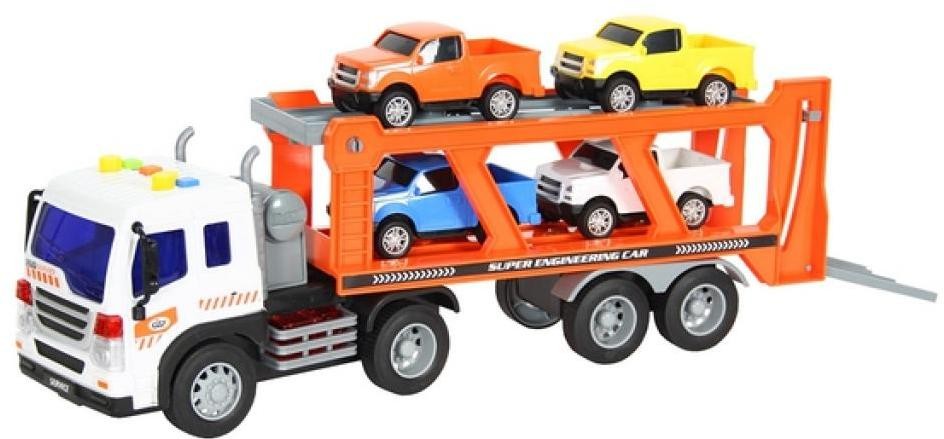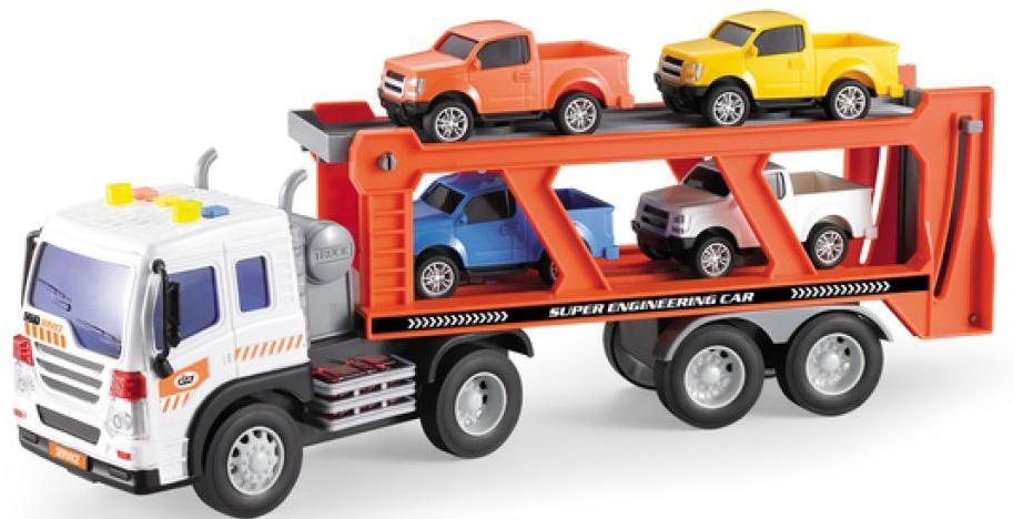 Інерційна машинка автовоз в зручному масштабі 1:16. У іграшкової машинки за допомогою кнопок на даху вмикається світло, звучить сирена і гарчить мотор. Рухомий механізм автовозу піднімається і опускається при натисканні на важіль. Іграшковий автовоз працює на фрикційній котушці - навіть з одного легкого поштовху модель набирає хорошу швидкість, тримає відмінне зчеплення з дорогою. Гумові покришки міцно встановлені на колесах, щоб малюк не зміг їх зняти. Іграшка машинка виготовлена з міцного пластику, відмінно деталізована і ретельно промальована.