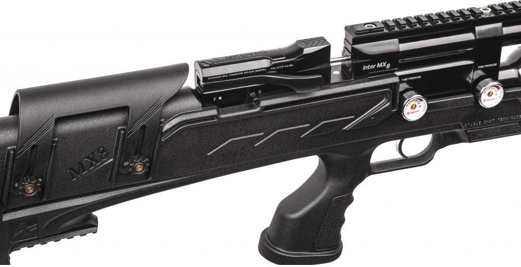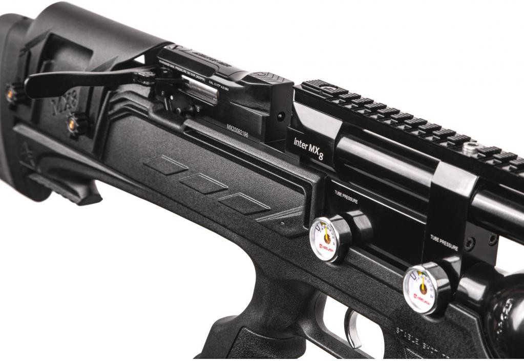 Пневматична PCP гвинтівка Aselkon MX8 Evoc Black - ергономічна пістолетна рукоятка має анатомічну форму, забезпечує надійний і зручний хват. Приклад з регульованим по висоті підщічником, завдяки якому, ви зможете комфортно підлаштуватися під оптичний приціл будь-якої висоти. Ложе виконано з міцного пластику, має м'який потиличник, що не тільки пом'якшує і без того незначну віддачу, але і забезпечує більш зручну вкладку, завдяки чому ви зможете вести більш купчасту і прицільну стрільбу.