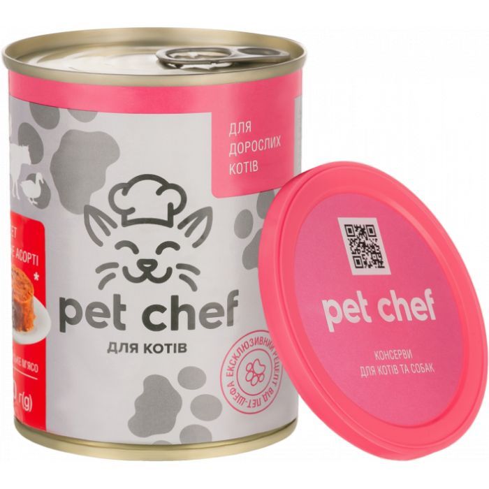 Pet Chef — ексклюзивний апетитний ситний продукт для кішок за новою рецептурою в зручних банках, захищених кришкою. Консерви Pet Chef виготовляються з українського м'яса та субпродуктів.
