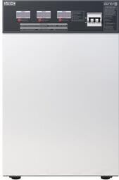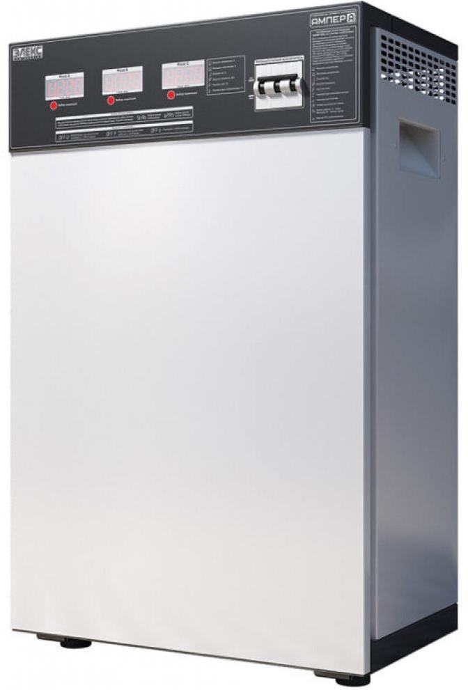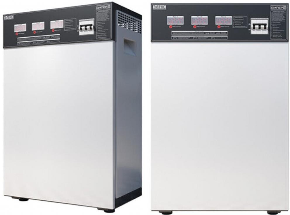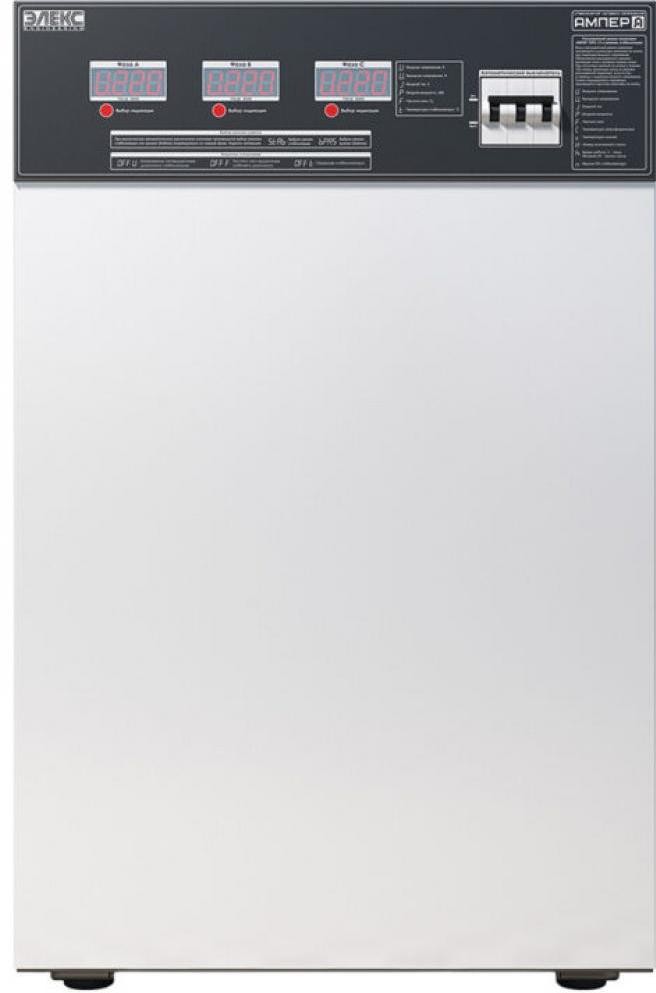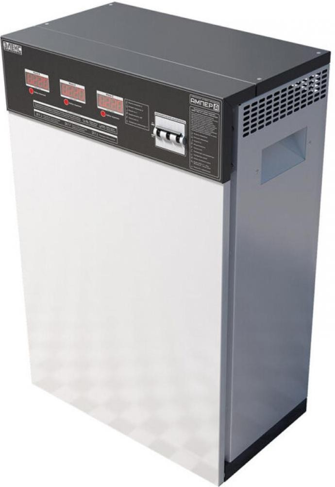 Трифазний стабілізатор напруги Ампер У 12-3 / 25 v2.0 призначений для роботи в трифазних електричних мережах з коливаннями напруги від 145 до 275В. У цьому діапазоні апарат гарантовано видає на виході напругу в рамках 220 ± 3,5%, що забезпечується за рахунок використання 12 ступенів стабілізації. Загальна номінальна потужність даної моделі 16.5 кВт (5.5 кВт на фазу), що відповідає робочому струму автоматичного вимикача 25А на ньому.