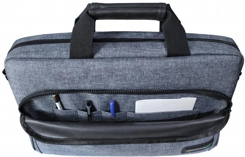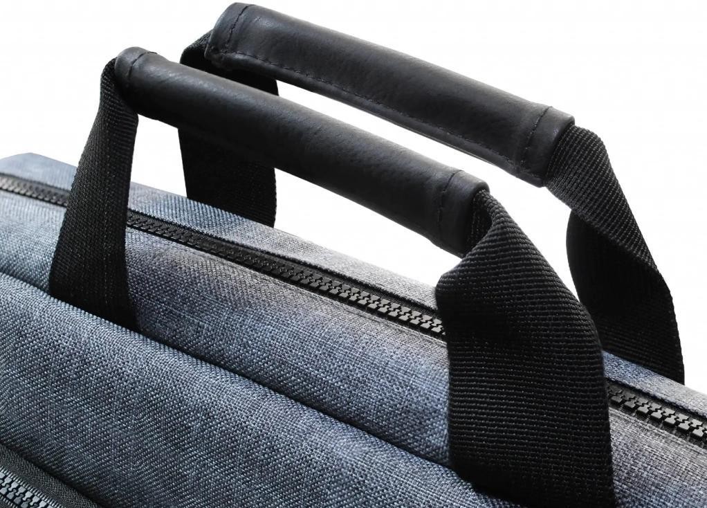 Сумка виготовлена з сучасного матеріалу, зовнішня сторона якого по кольору та структурі нагадує денімову тканину, а внутрішня - водовідштовхуюча. Ударопоглинаючі вставки в стінках захищають ноутбук від ударів і тримають форму, а ручки виготовлені з штучної шкіри додають комфорту в експлуатації.