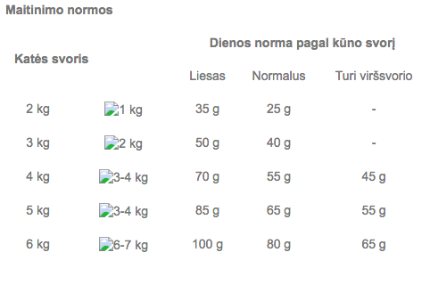 - Skirta katėms Maistas skirstomas pagal amžių (kačiukams, suaugusioms katėms), veislę ir būna skirtas specialiai sterilizuotoms katėms. Vyresnio amžiaus