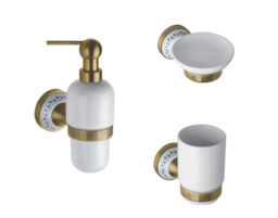 Материал аксессуара Помня о том, что ванная комната с повышенной влажностью «выставляет» высокие требования к качеству материалов, современные производители изготавливают аксессуары из надежного сырья. Стекло, керамика, пластик, металл – аксессуары из этих материалов представлены на рынке в широком ассортименте, и у каждого из них есть свои преимущества. Так, пластиковое изделие – один из самых недорогих вариантов, который может похвастаться богатой цветовой гаммой. Дороже обойдутся стеклянные аксессуары, в то же время они обещают сделать Ваш интерьер максимально стильным и привлекательным. Вы сами можете определить, аксессуары из какого стекла – матового, прозрачного, полупрозрачного или цветного – подойдут больше всего. «Долго жить» и не менее красиво и практично обустроить ванную комнату обещают изделия из керамики, а также нержавеющей стали. Нанесенное покрытие делает их более устойчивыми к влаге. Немаленькой популярностью сегодня пользуются аксессуары, изготовленные из нескольких материалов, – к примеру, выигрышно смотрится хромированный держатель, на который крепится стакан из матового стекла. Материал аксессуаракерамика,латунь