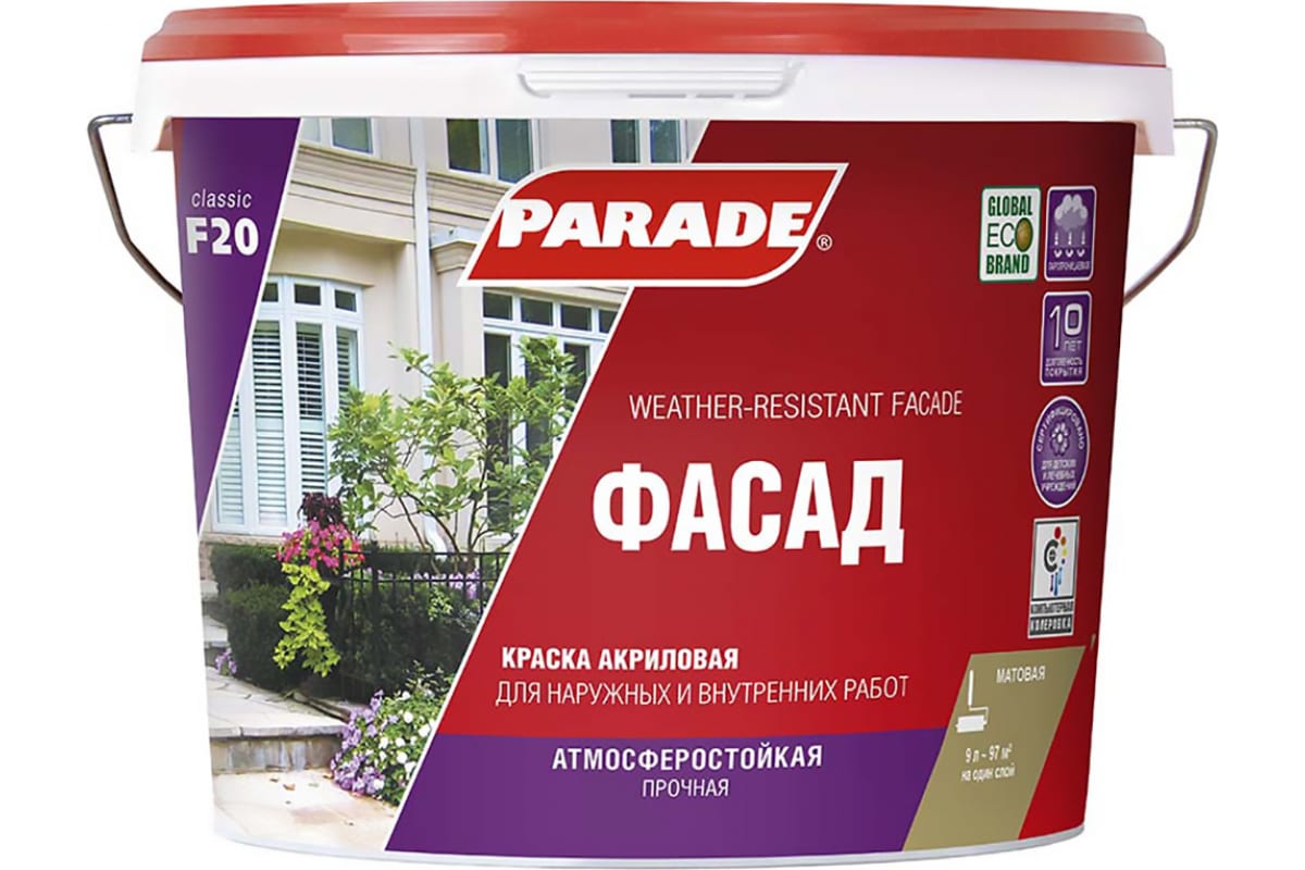 Краска фасадная PARADE F20 база А 9 л Россия 90002002348 - акриловая водно-дисперсионная фасадная краска. Образует паропроницаемое матовое покрытие, устойчивое к атмосферным воздействиям, УФ лучам, перепаду температур, влаге. Обладает высокими декоративными свойствами, отличной укрывистостью и прочным сцеплением с основанием.
