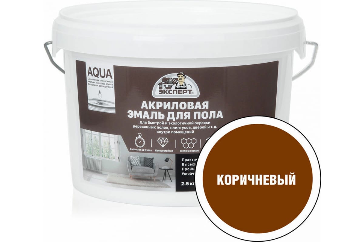 Эмаль для пола акриловая ЭКСПЕРТ коричневая 2,5 кг 28376 - износостойкая полуглянцевая экологичная акриловая эмаль для окраски деревянных полов, плинтусов, дверей внутри помещений. Может применяться для окраски бетонных полов внутри бытовых помещений. Быстро сохнет, не пахнет.