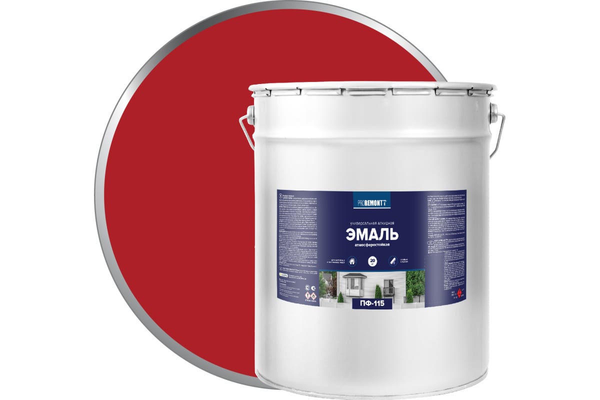 Эмаль PROREMONTT ПФ-115 красная, 20 кг Лк-00004471 используется при проведении отделочных работ внутри и вне помещений.