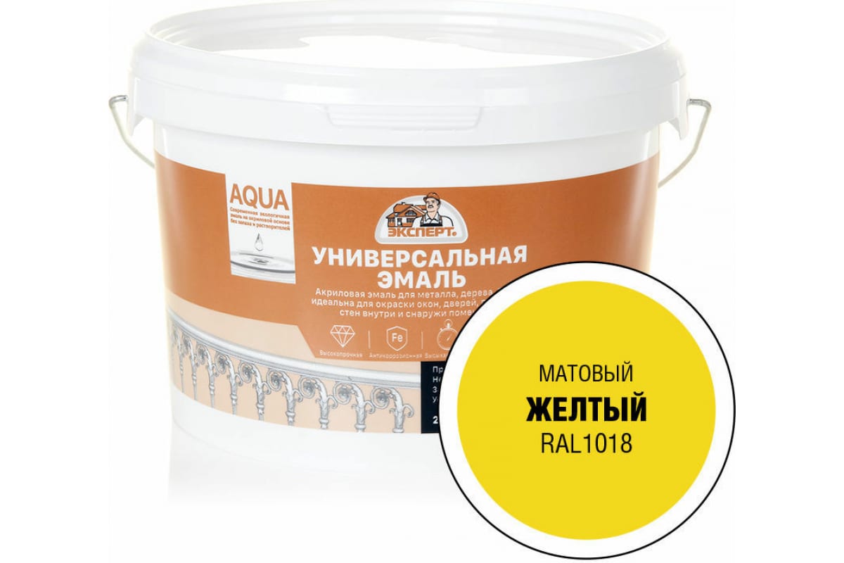 Эмаль универсальная акриловая матовая ЭКСПЕРТ желтый RAL 1018 2,5 кг 29087 - универсальная экологичная акриловая эмаль для металлических, деревянных, бетонных и ранее окрашенных окон, дверей, плинтусов, стен внутри и снаружи помещений. Эмаль быстро сохнет, не пахнет.