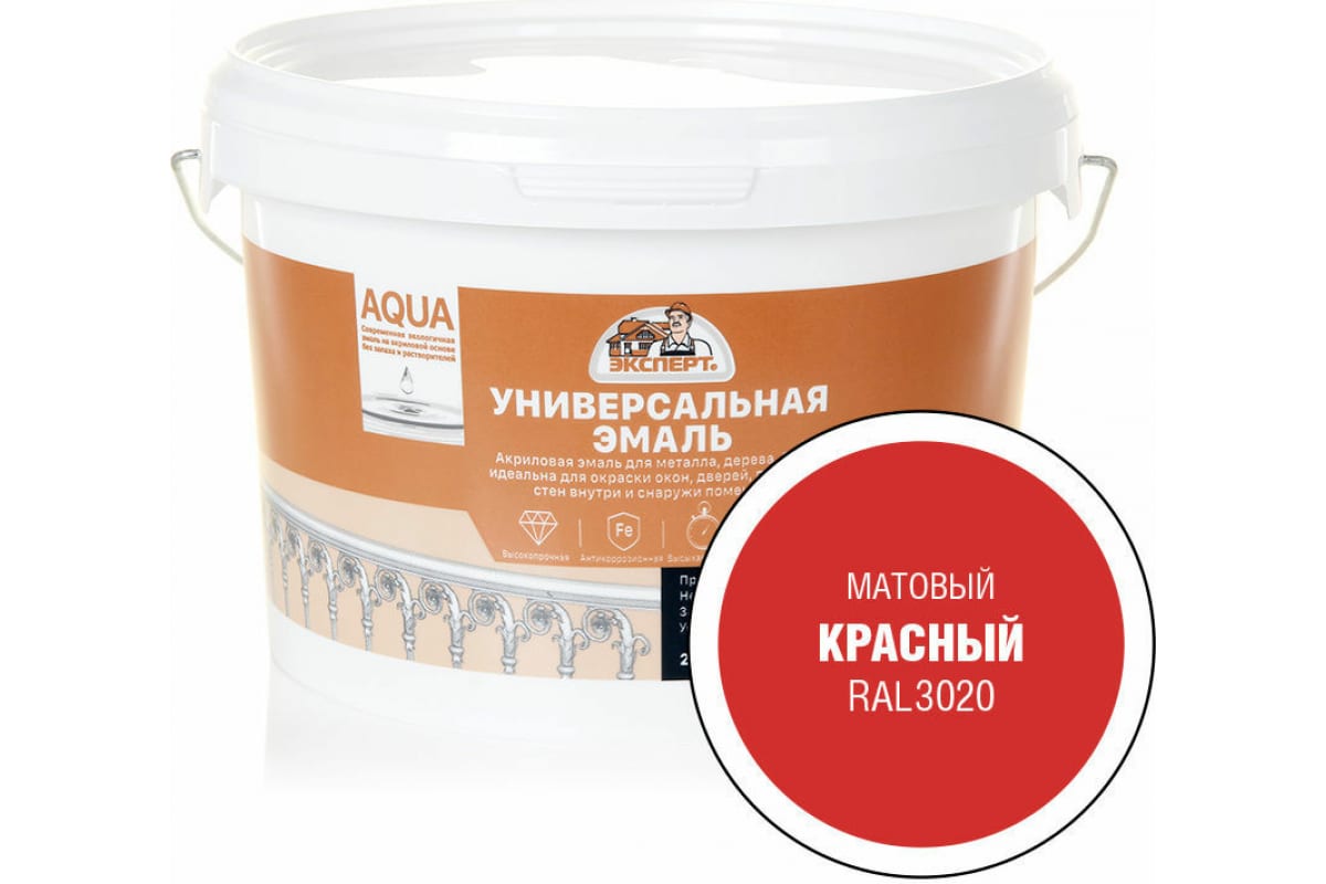 Эмаль универсальная акриловая матовая ЭКСПЕРТ красный RAL 3020 2,5 кг 29092 - универсальная экологичная акриловая эмаль для металлических, деревянных, бетонных и ранее окрашенных окон, дверей, плинтусов, стен внутри и снаружи помещений. Эмаль быстро сохнет, не пахнет.