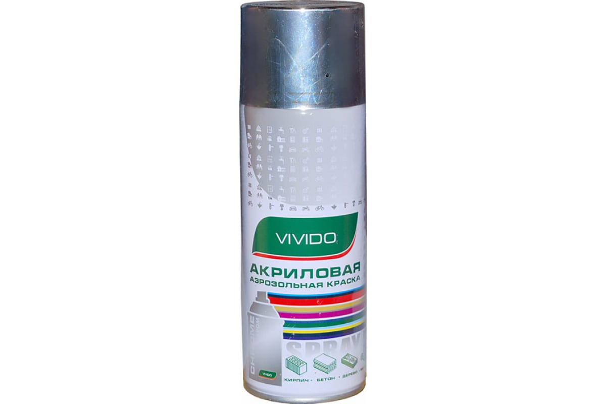 Акриловая аэрозольная краска Vivido хром, металлик VICH предназначена для высококачественного окрашивания деревянных, металлических, пластиковых, каменных, бетонных, керамических и др. поверхностей. Служит для обработки различного оборудования, приборов, мебели, оконных рам, дверей, дверных ручек, элементов сантехники, инструментов, предметов декора, изделий ручной работы, автомобилей, мотоциклов и прочего.