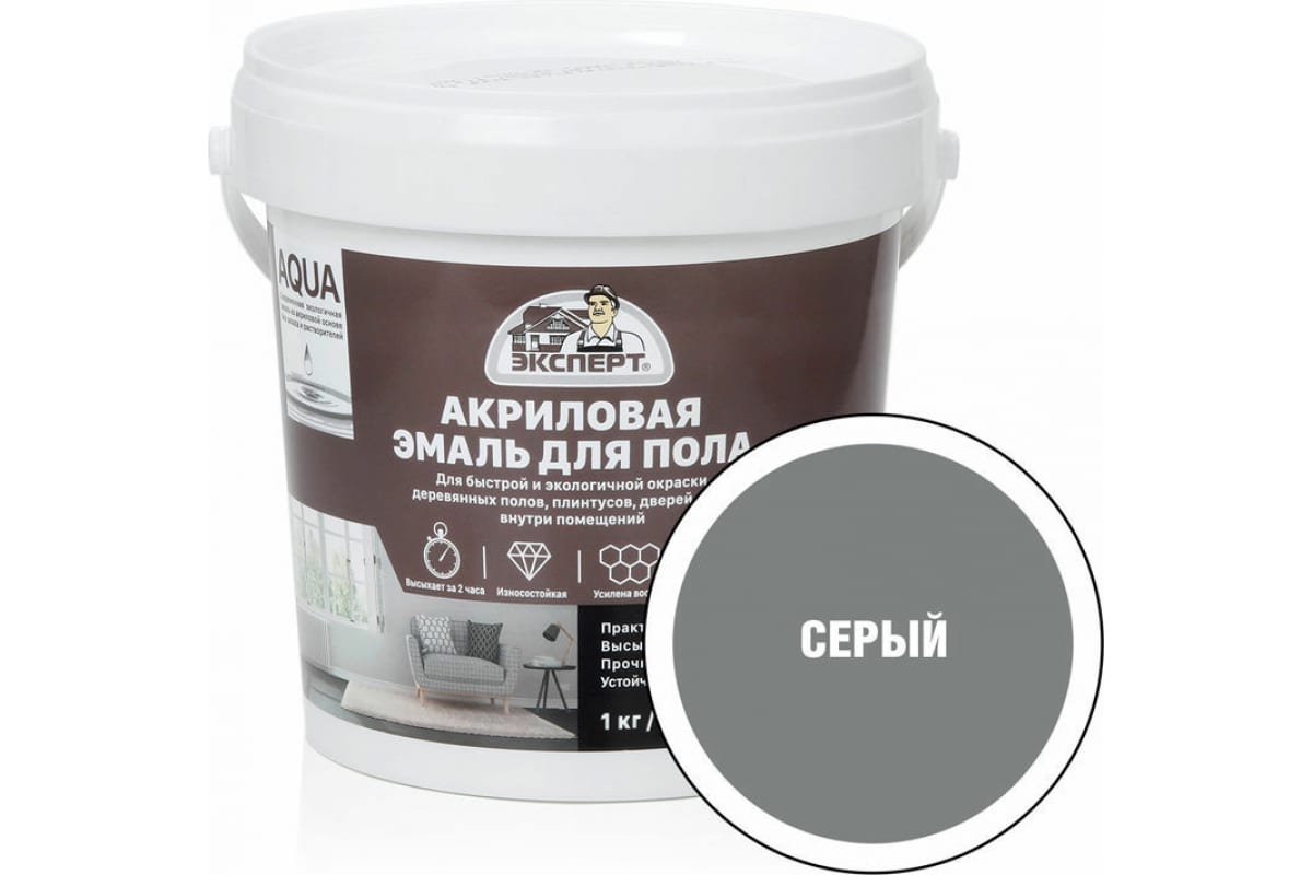 Эмаль для пола акриловая ЭКСПЕРТ серая 1 кг 28374 - износостойкая полуглянцевая экологичная акриловая эмаль для окраски деревянных полов, плинтусов, дверей внутри помещений. Может применяться для окраски бетонных полов внутри бытовых помещений. Быстро сохнет, не пахнет.