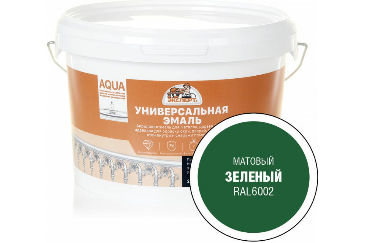Эмаль универсальная акриловая матовая ЭКСПЕРТ зеленый RAL 6002 2,5 кг 29090 - универсальная экологичная акриловая эмаль для металлических, деревянных, бетонных и ранее окрашенных окон, дверей, плинтусов, стен внутри и снаружи помещений. Эмаль быстро сохнет, не пахнет.