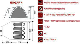Палатка треккинговая, количество мест 4, количество входов 1, форма палатки полубочка, количество дуг 3, материал каркаса: стеклопластик, водостойкость тента 4000 мм вод, ст, вес комплекта 4.7 кг, высота 130 см.