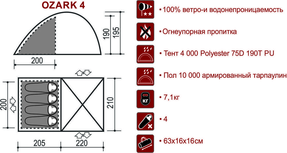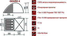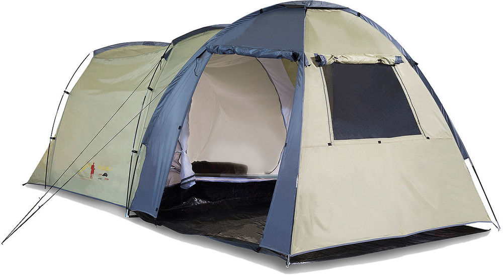 Палатка кемпинговая, количество мест 4, количество входов 3, форма палатки полусфера, материал каркаса: стеклопластик, водостойкость тента 4000 мм вод, ст, вес комплекта 7.1 кг, высота 195 см.
