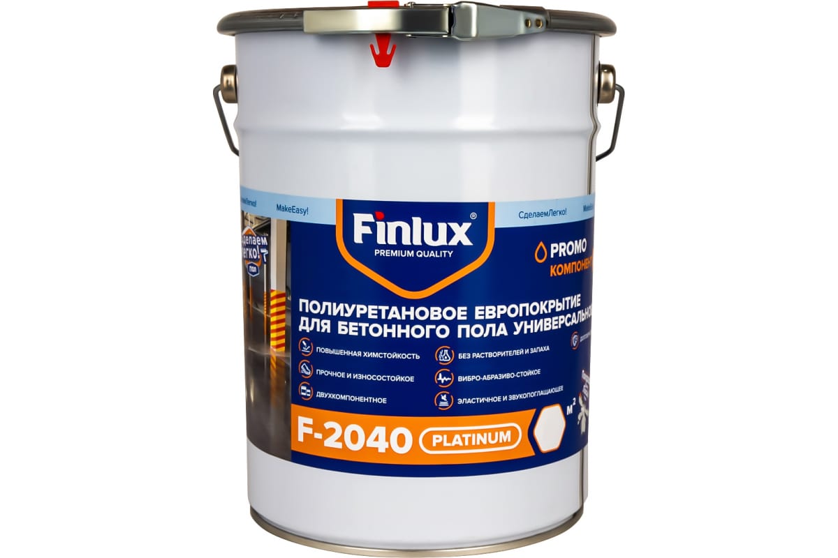 Полиуретановое европокрытие для бетонного пола Finlux F-2040 двухкомпонентное, серый, 10 кв. м 4603783200627 - это уникальный полиуретановый наливной компаунд с антискользящим эффектом для бетонного пола и создания за 24 часа высокоглянцевого эластичного бесшовного Европокрытия, с высокой устойчивостью к вибрациям и механическим нагрузкам на бетонных, цементно-песчаных, кафельных, жестких металлоконструкциях (дополнительно защищенным от коррозии), и других основаниях с высокой эксплуатационной нагрузкой.