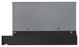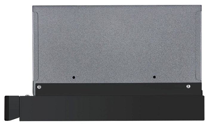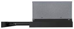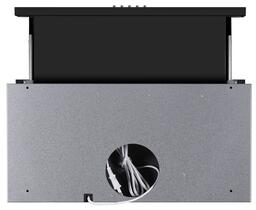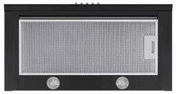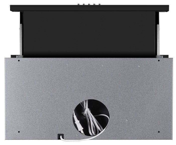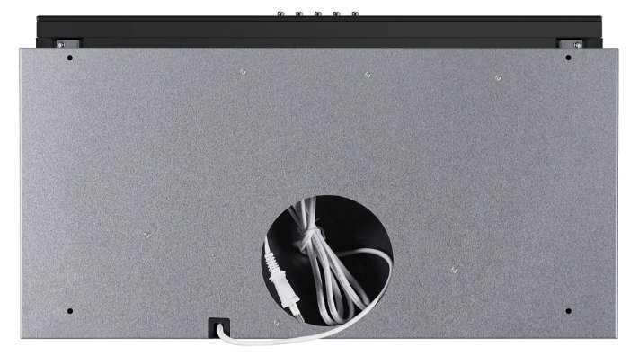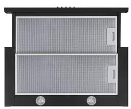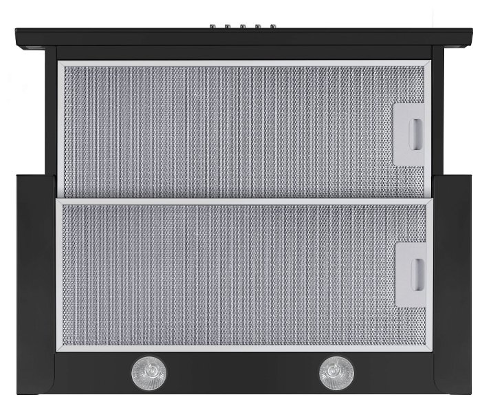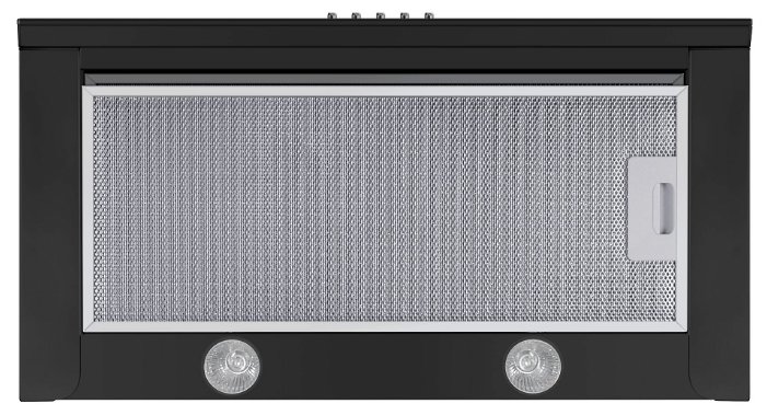 Корпус сделан из нержавеющей стали. Фронтальная и выдвижная панели выполнены в черном цвете. Два многослойных жироулавливающих фильтра из алюминия легко вынимаются из вытяжки и полностью разбираются, что сильно упрощает их чистку.