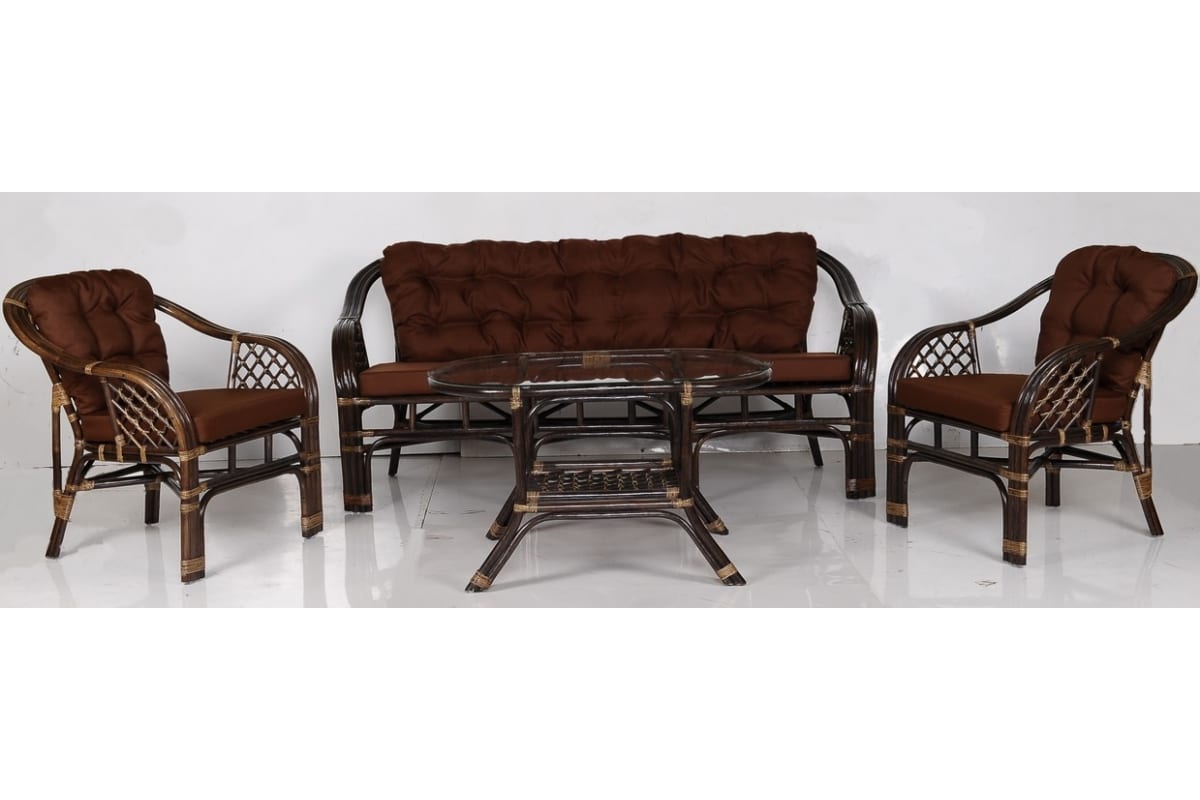 Комплект изготовлен из натурального ротанга, он имеет привлекательный внешний вид и отличается прочностью. Благодаря использованию данного материала изделия обладают небольшим весом и экологичностью.