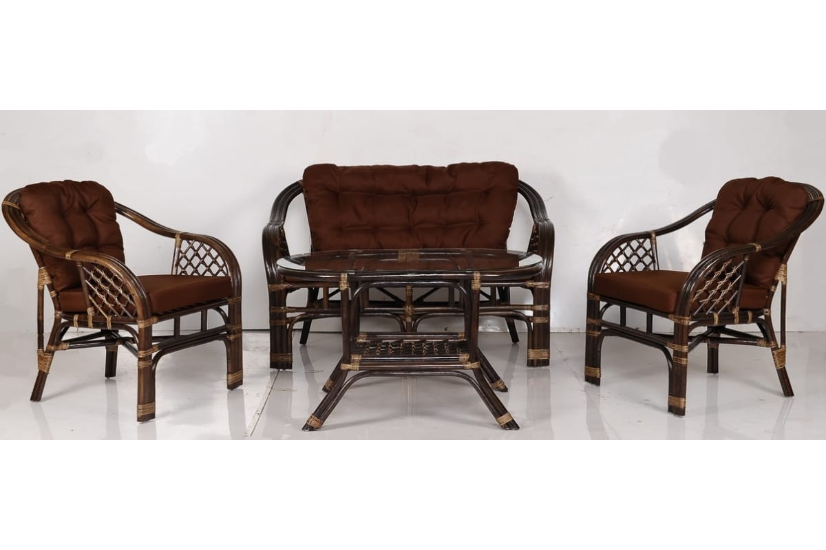 Комплект изготовлен из натурального ротанга, он имеет привлекательный внешний вид и отличается прочностью. Благодаря использованию данного материала изделия обладают небольшим весом и экологичностью.