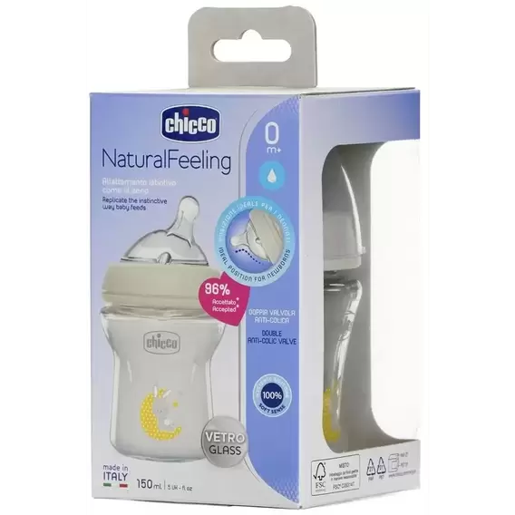 Бутылочка стеклянная Chicco Natural Feeling c силиконовой соской 0м+ 150 мл (81211.30 )