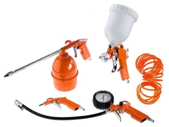 - Комплектация каскораспылитель с верхним пластиковым бачком объемом 600 мл., пистолет для промывки и смазки, шланг спиральный воздушный 5м., пистолет для подкачки шин с манометром, пистолет для продувки